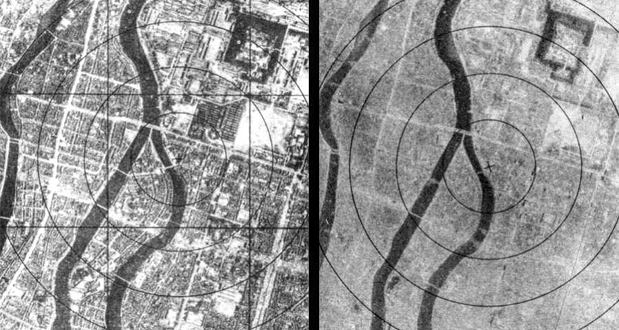 Before and After Aerial Images Hiroshima Bombing, Courtesy of US Department of Defense.