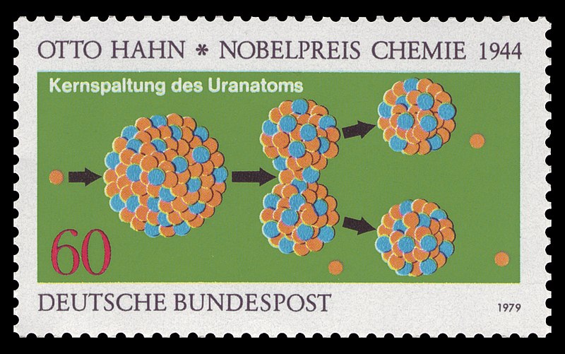 One stamp in the stamp series for nobel prize winners of physics and chemistry, the one crediting Otto Hahn with the discovery of nuclear fission, Germany 1979. Courtesy of Wikipedia Commons.
